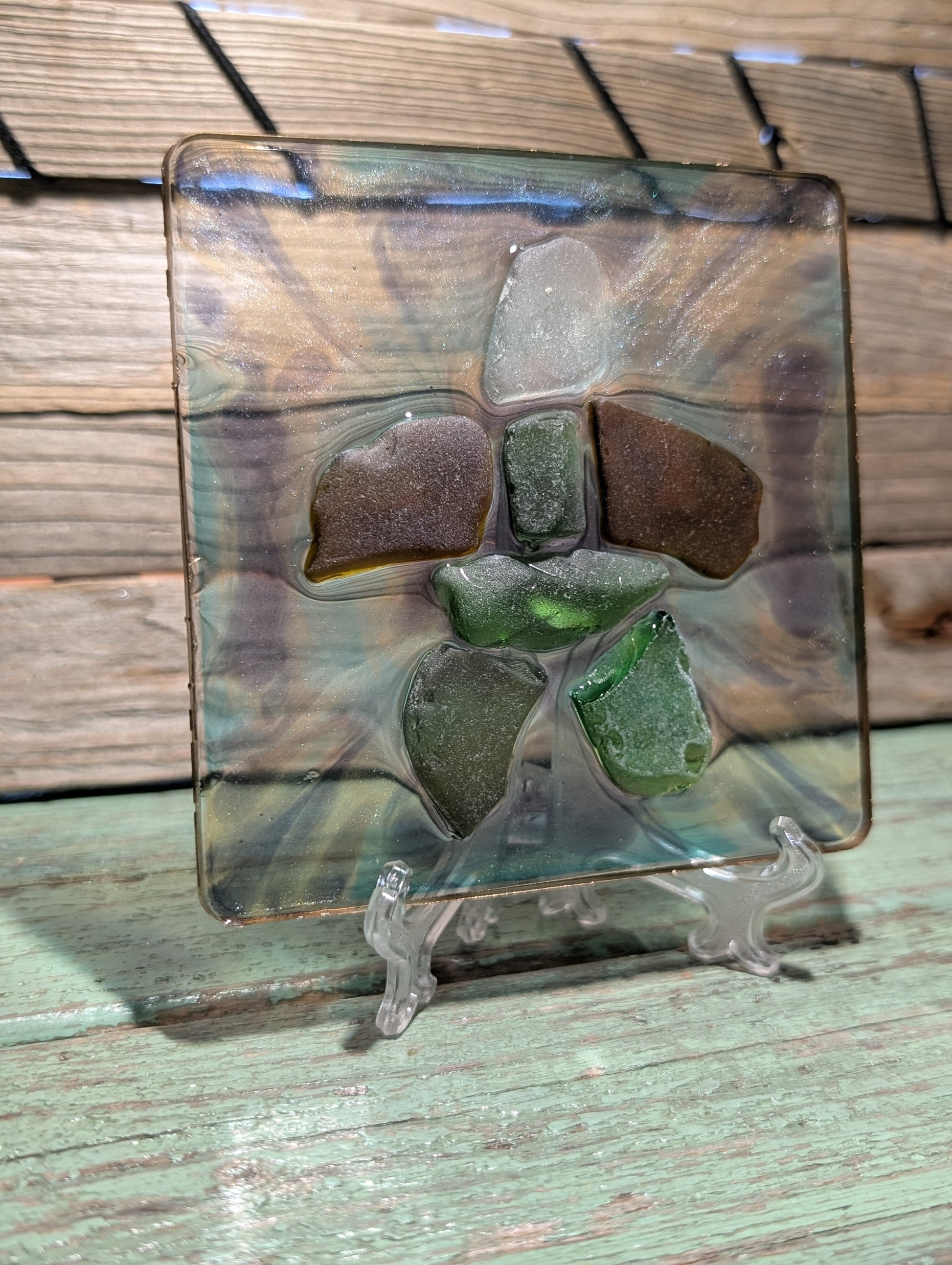 Enhance your home decor with our Beach Glass Inuksuk. Handcrafted with UV resin and authentic tumbled beach glass from the Atlantic Ocean, this 10cm square piece features 7 larger pieces of brown, green, and white glass. The bronze chrome edge detail adds a touch of elegance. Includes a stand for effortless display.