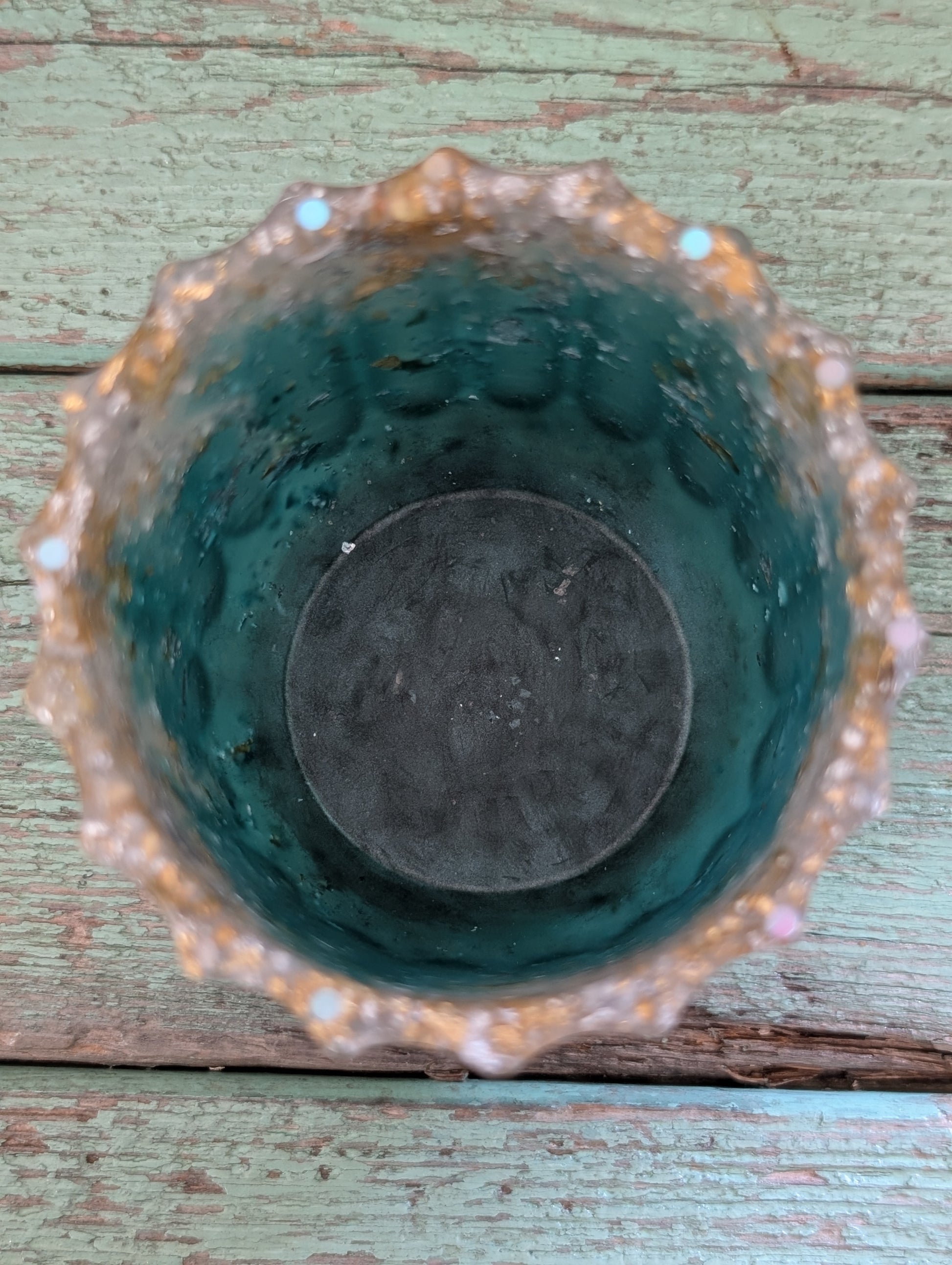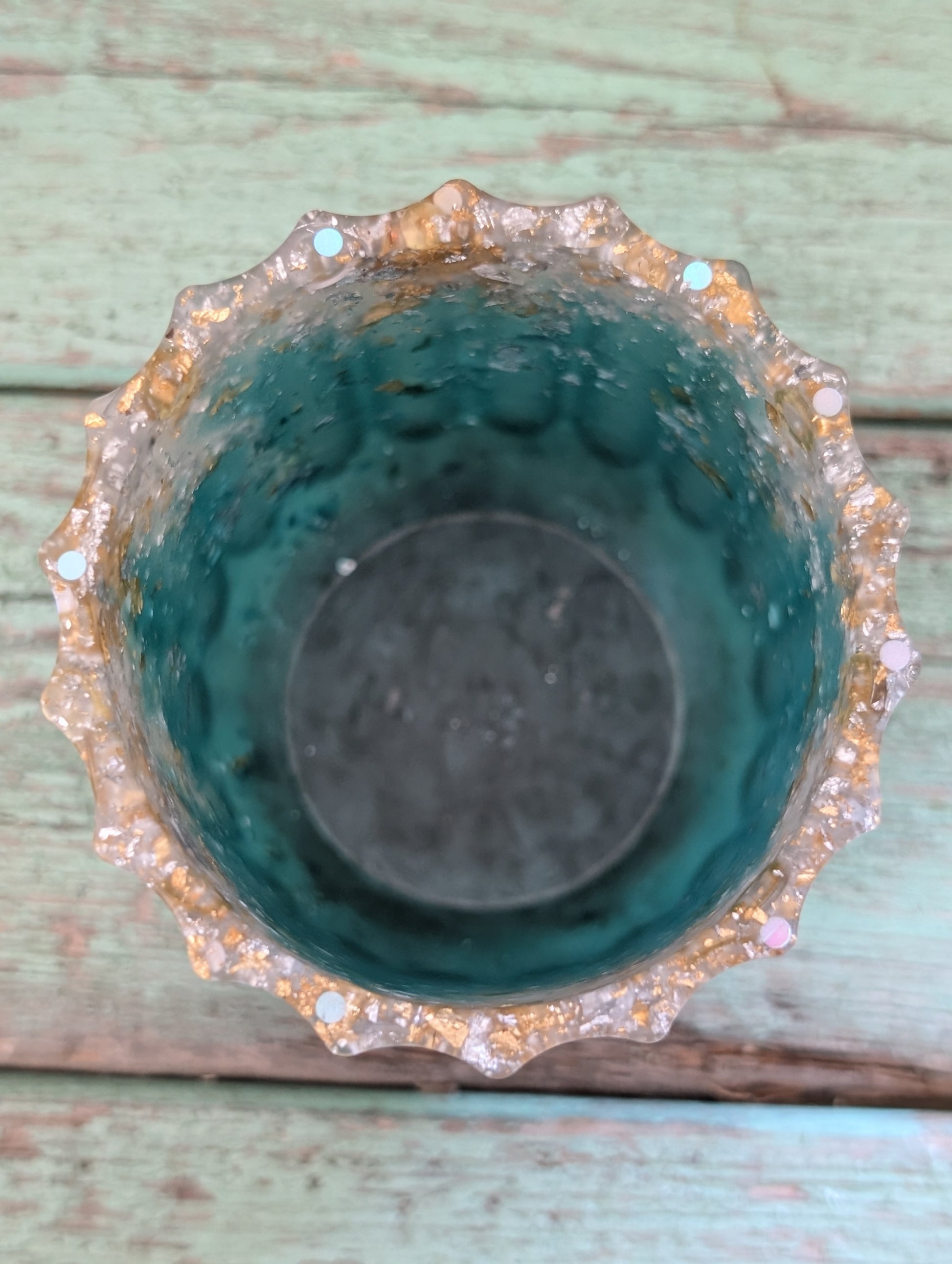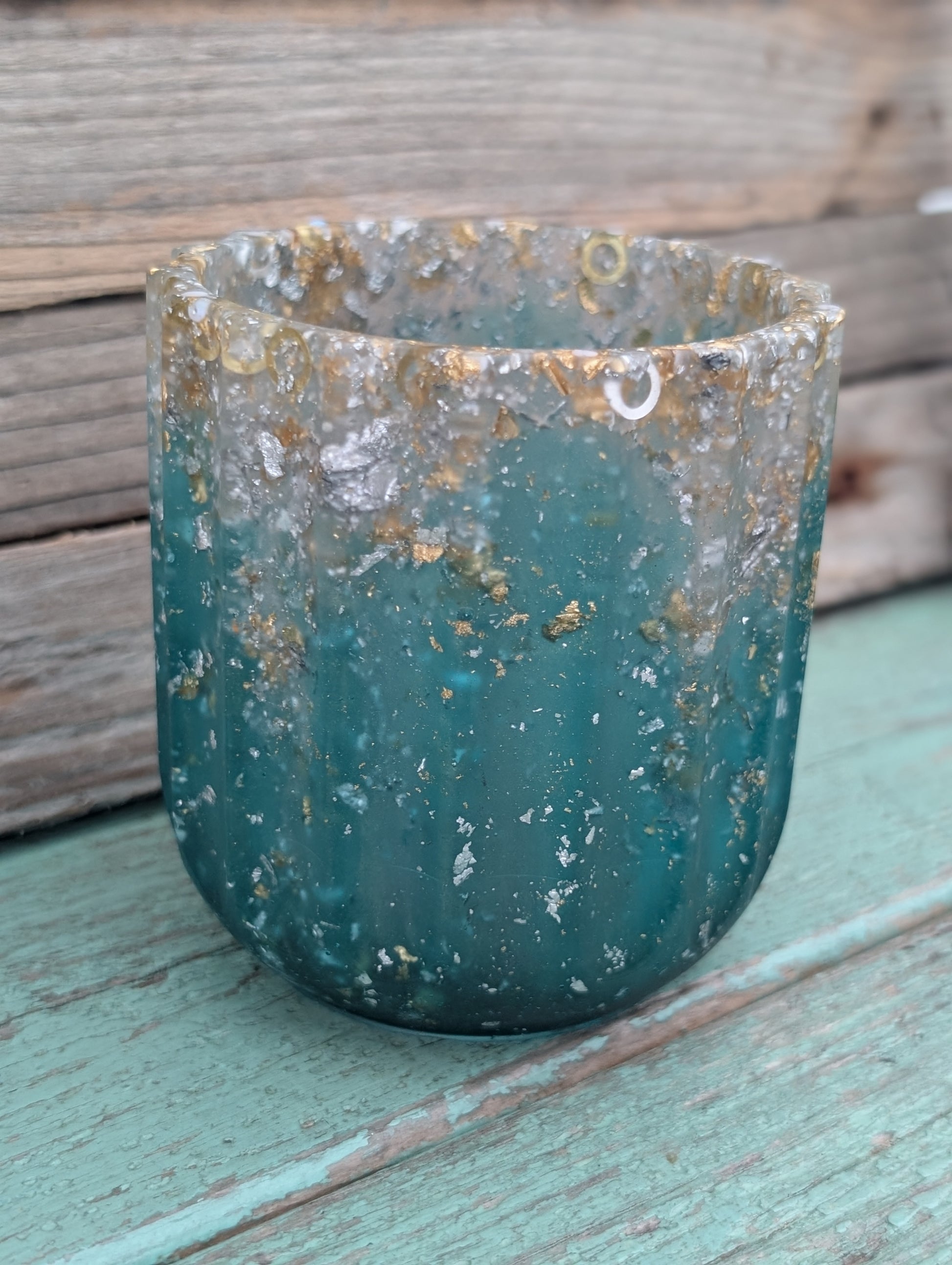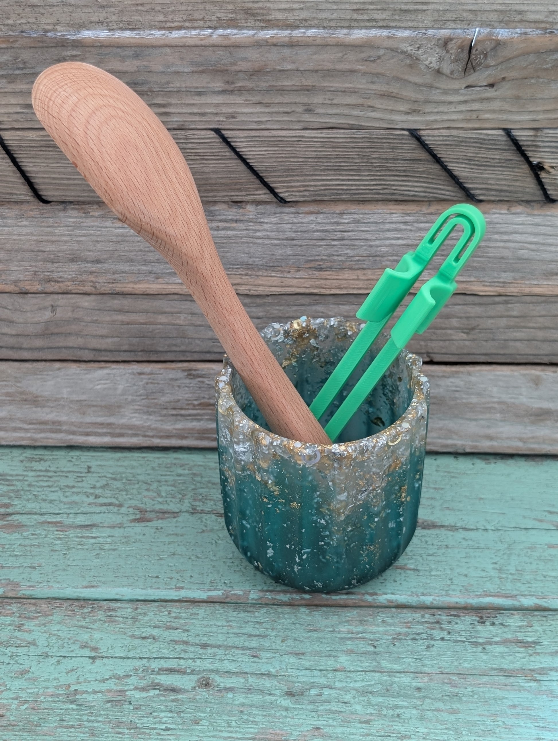 Meet the Catchall Vase: a stunning teal wonder that’s not just for flowers—oh no! This multi-talented gem can wrangle your pens, kitchen doodads, or even those rebellious crochet hooks. With swirls of gold, silver, and copper flakes, it shines like the ocean on a sunny day! Talk about a catch-all!