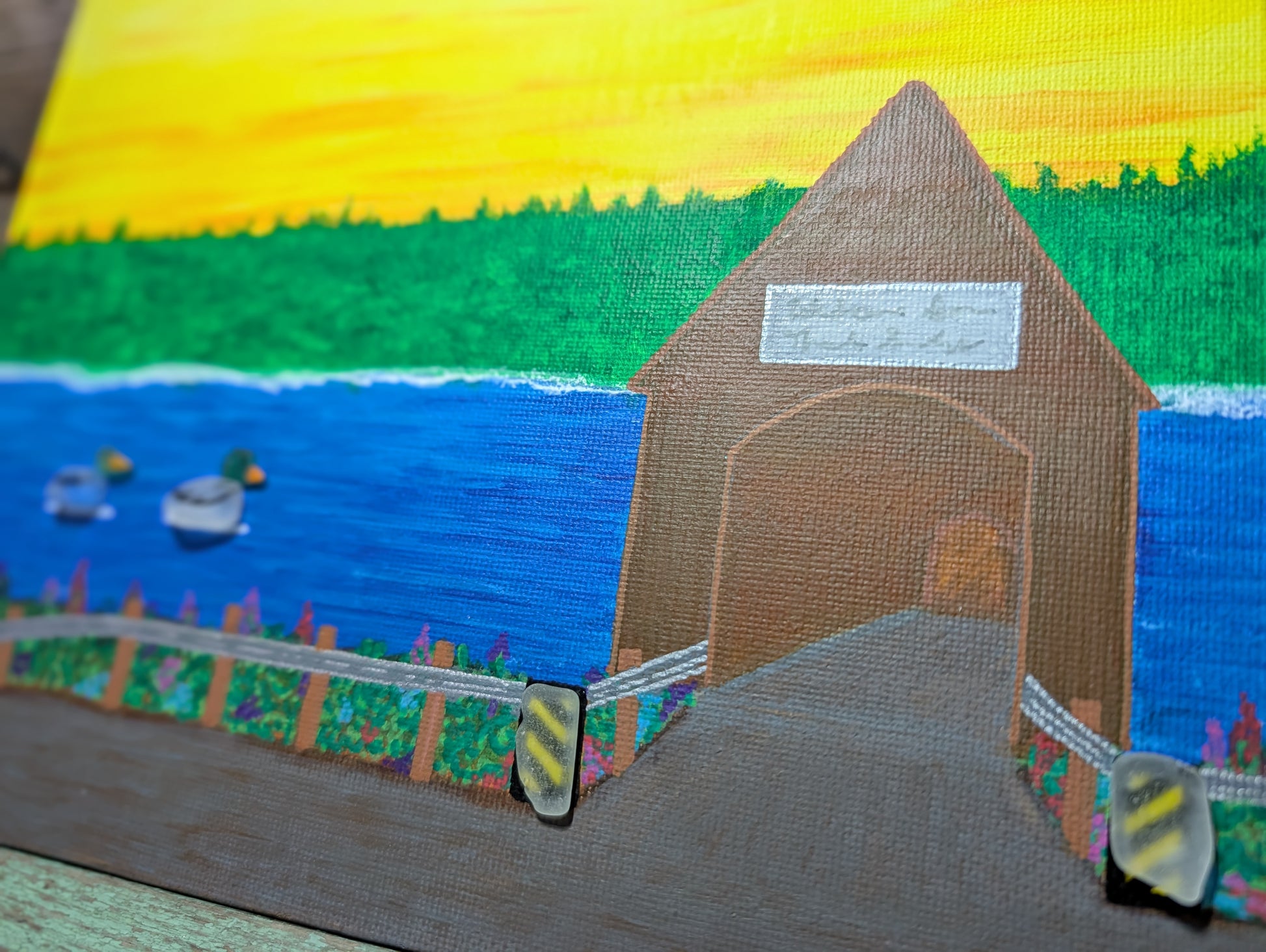 Bring the charm of New Brunswick home with this quirky Covered Bridge Canvas! Hand-painted with a splash of acrylic flair and sprinkled with real beach glass (because who doesn’t love a good beach day?). Sized at 7.5x9 inches, it's a coastal masterpiece ready to stick around your walls—literally, thanks to the wall stickies!