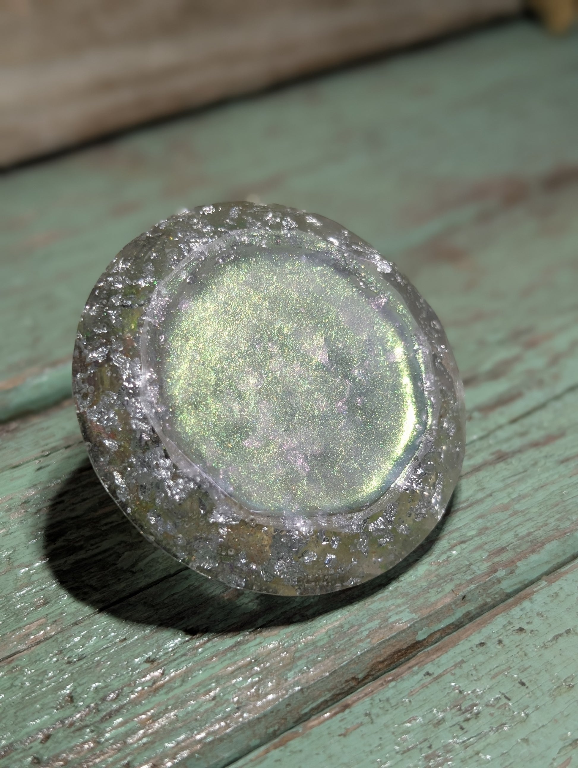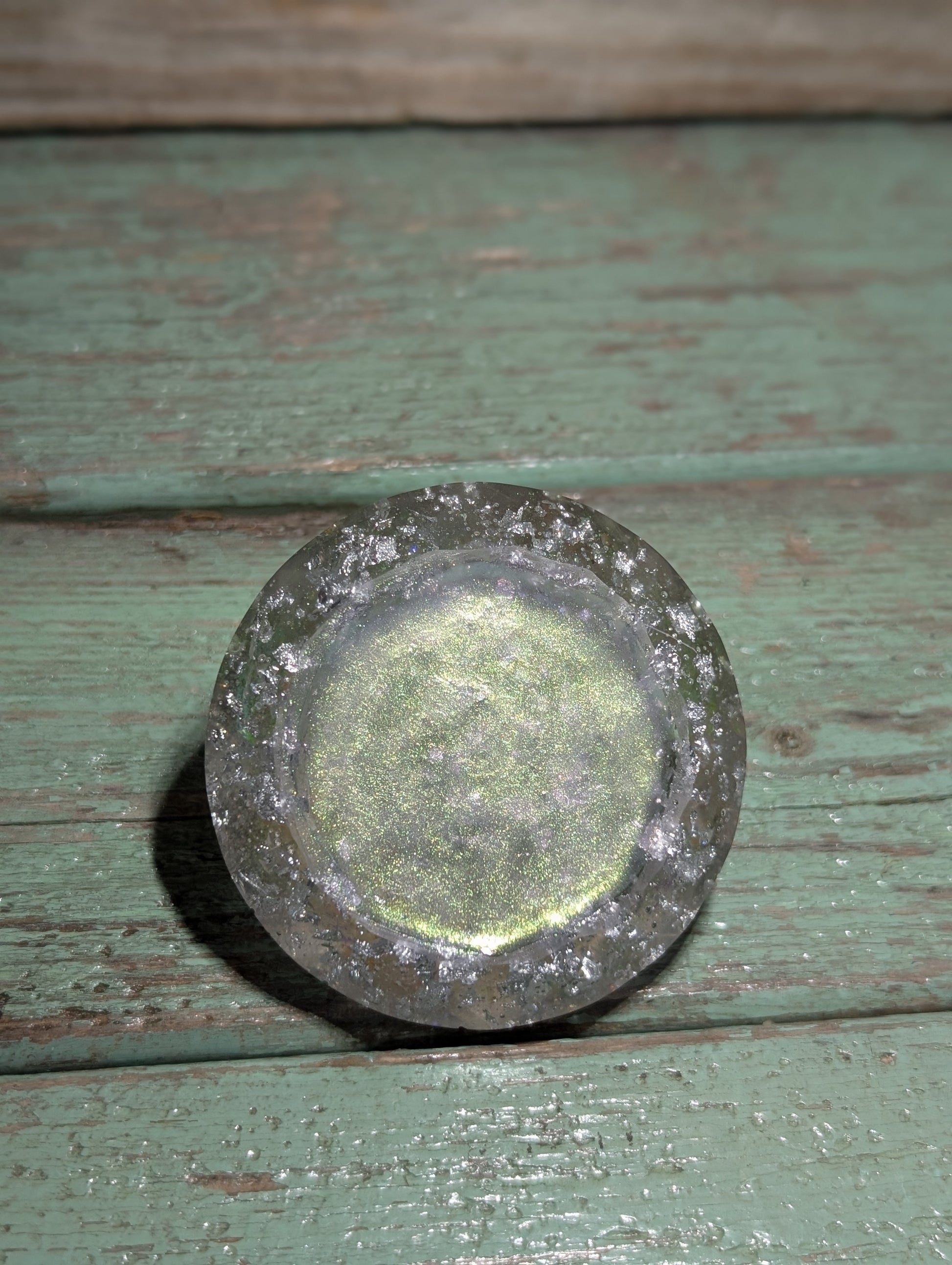 The Diamond Flake Decor is not your ordinary home decor piece. Made with epoxy resin, it boasts a stunning diamond shape with accents of mica powder, silver flakes, and glitters. Its unique design also features a layer of mermaid magic tint, protected by UV resin. Perfect for displaying on a shelf or using as a paperweight, this piece measures 6cm wide and 3.5cm tall, adding a touch of elegance to any room.