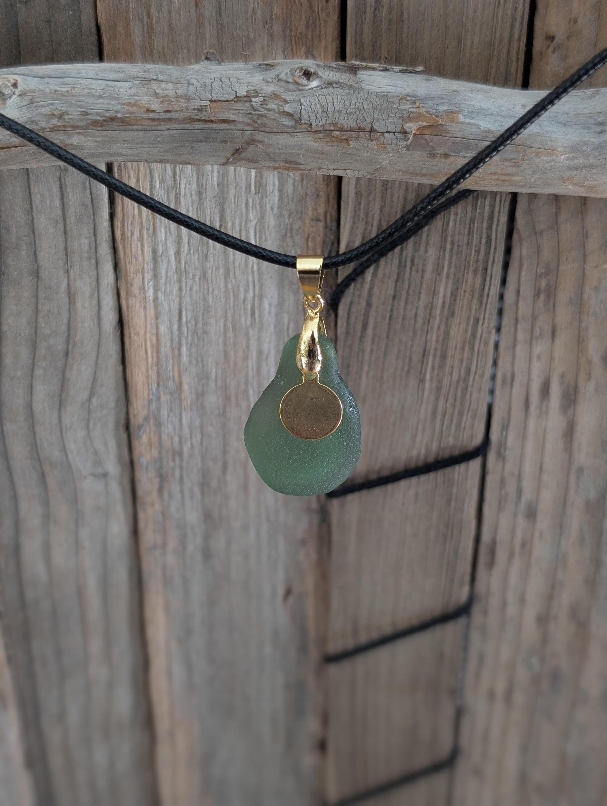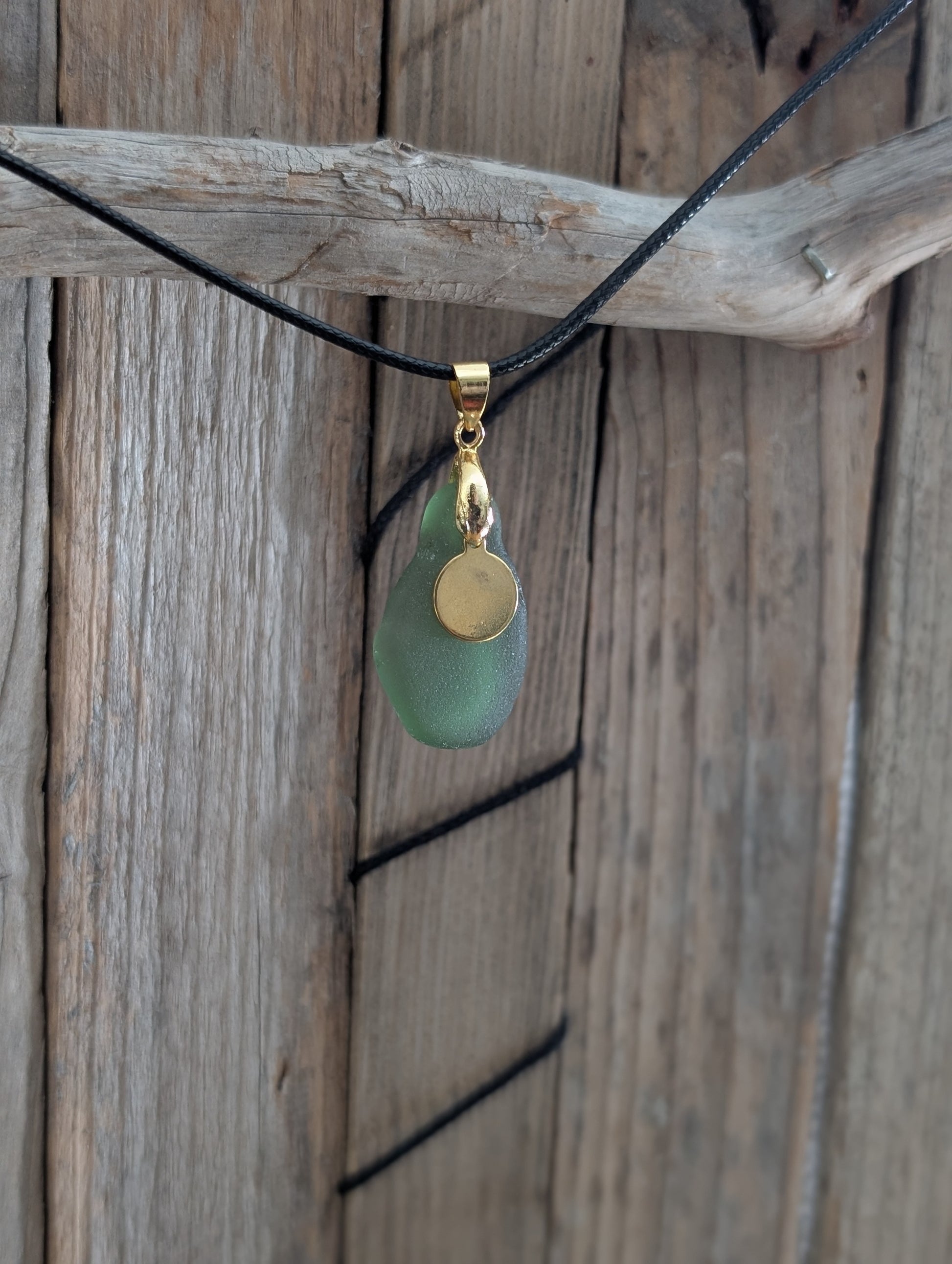 Dive into a treasure from the tides with our Green Beach Glass Necklace! Handpicked from Nova Scotia, this beauty boasts a golden circle detail to keep things shiny (because who doesn’t love a little bling?). Attached to a sturdy black cord with lobster claw closures, it's perfect for those who want to make waves without getting wet!