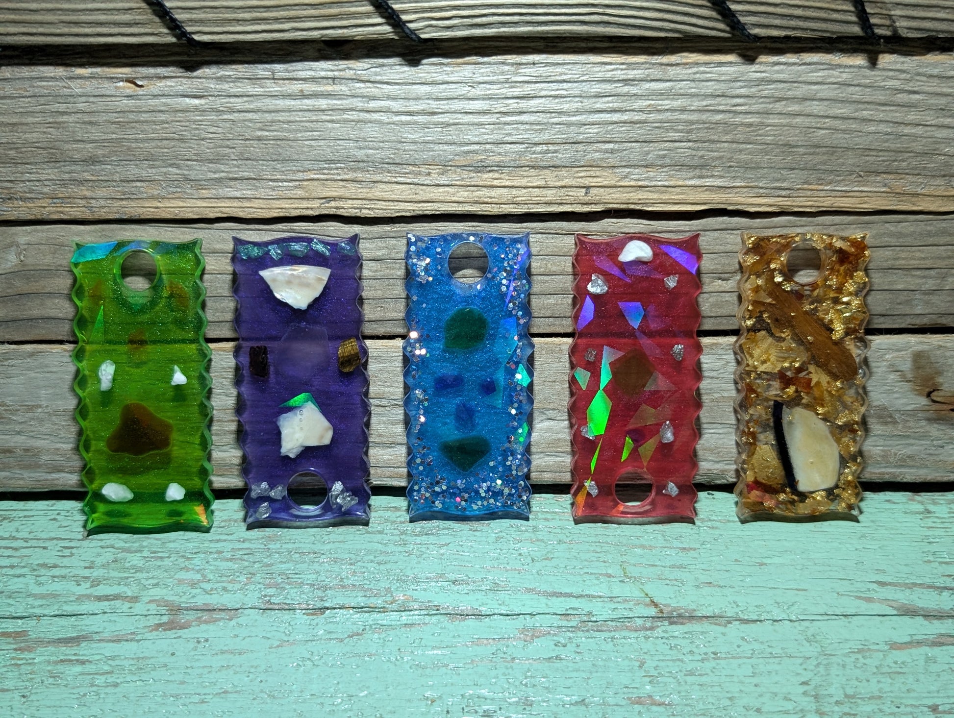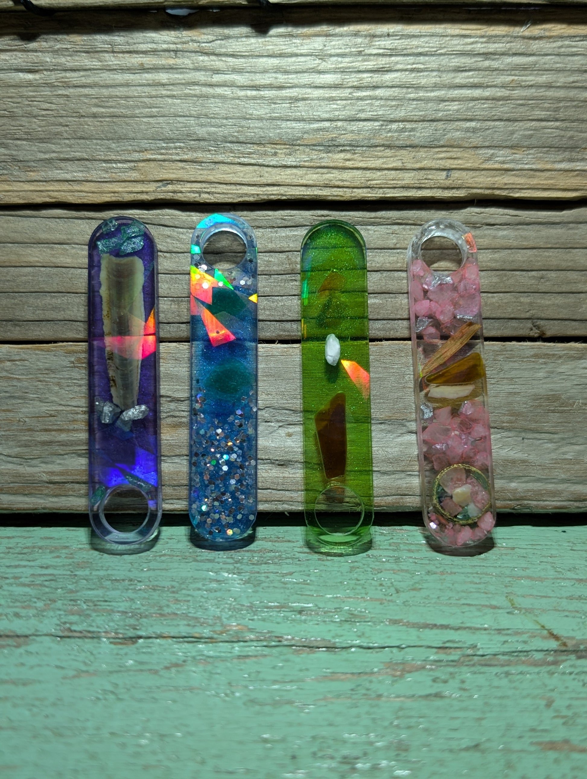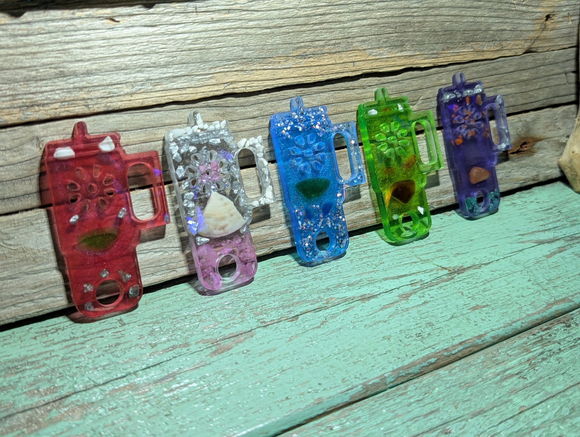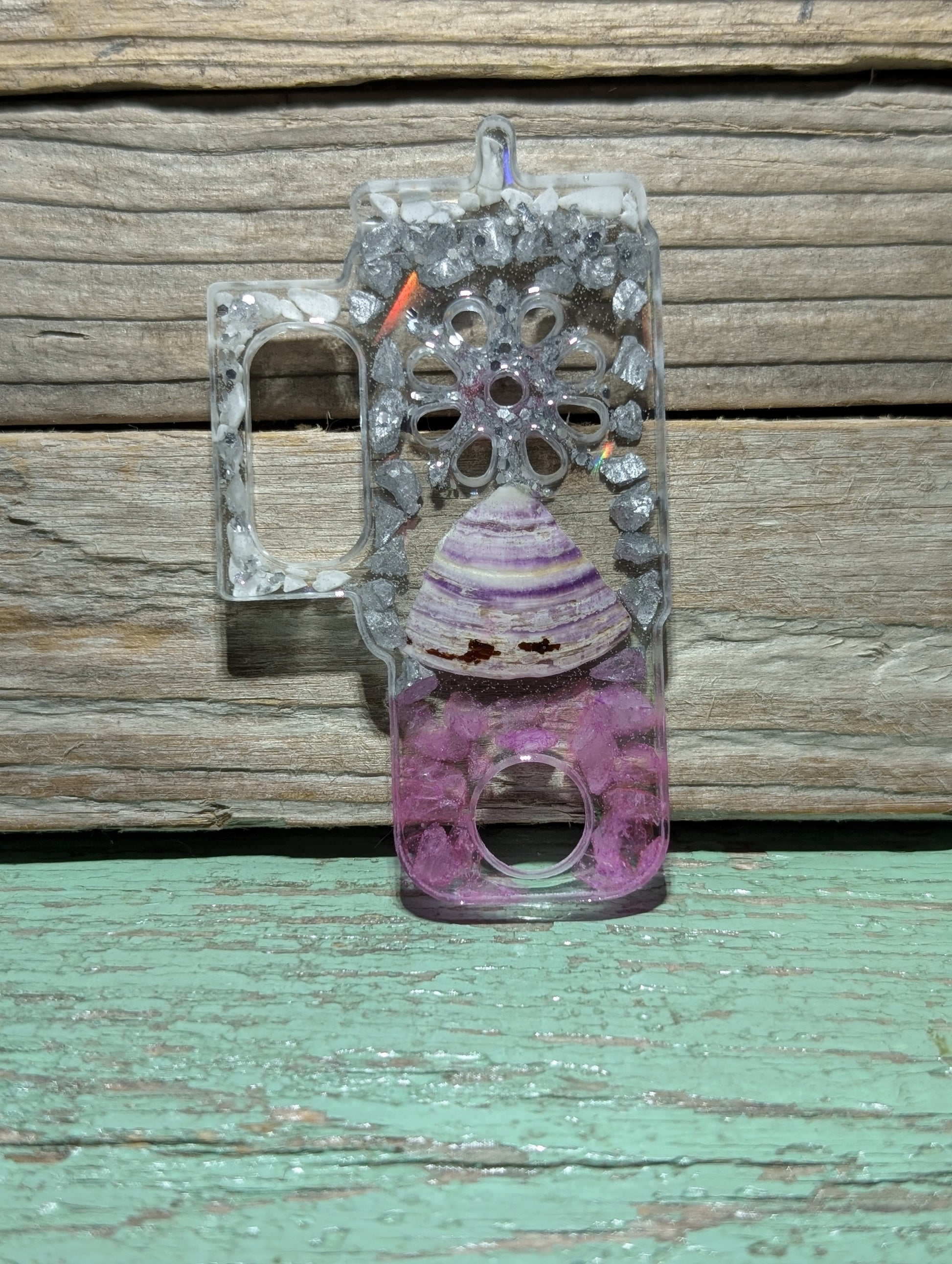 Made from a dazzling halographic mold and epoxy resin, these beauties flaunt genuine Atlantic Ocean beach treasures like tumbled glass, shell, stones and driftwood.