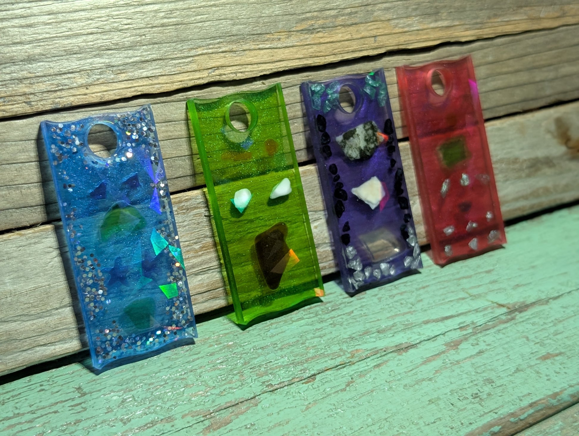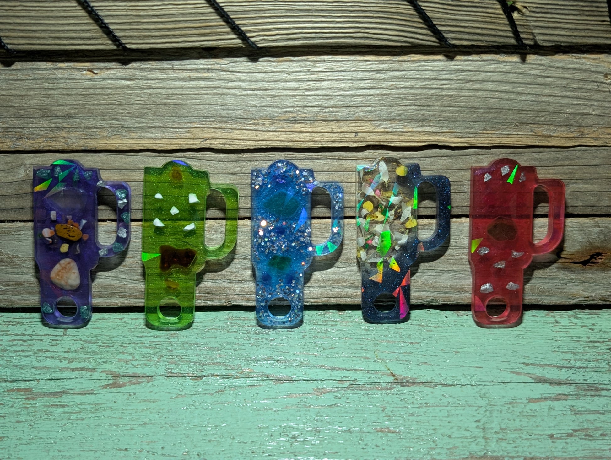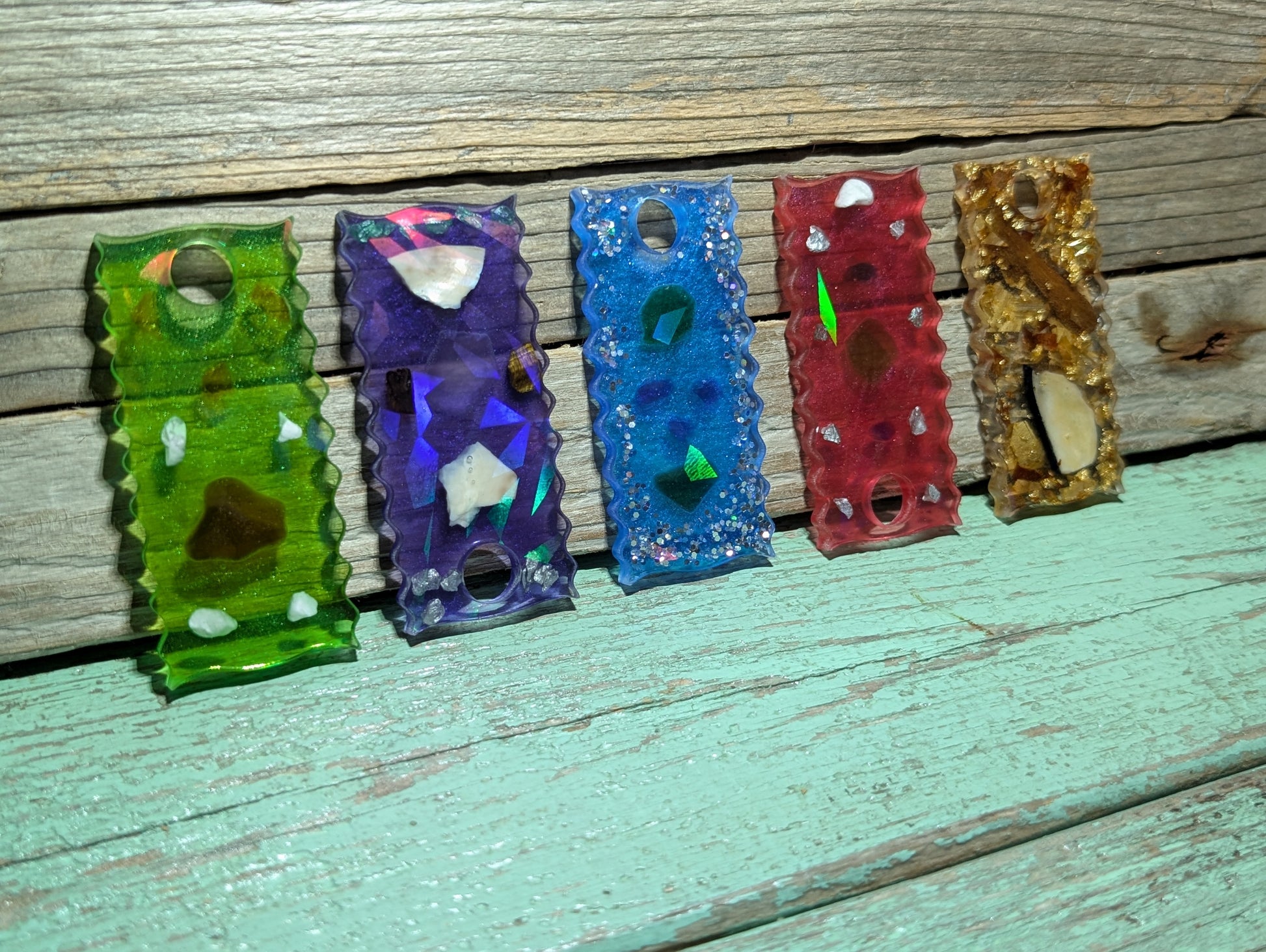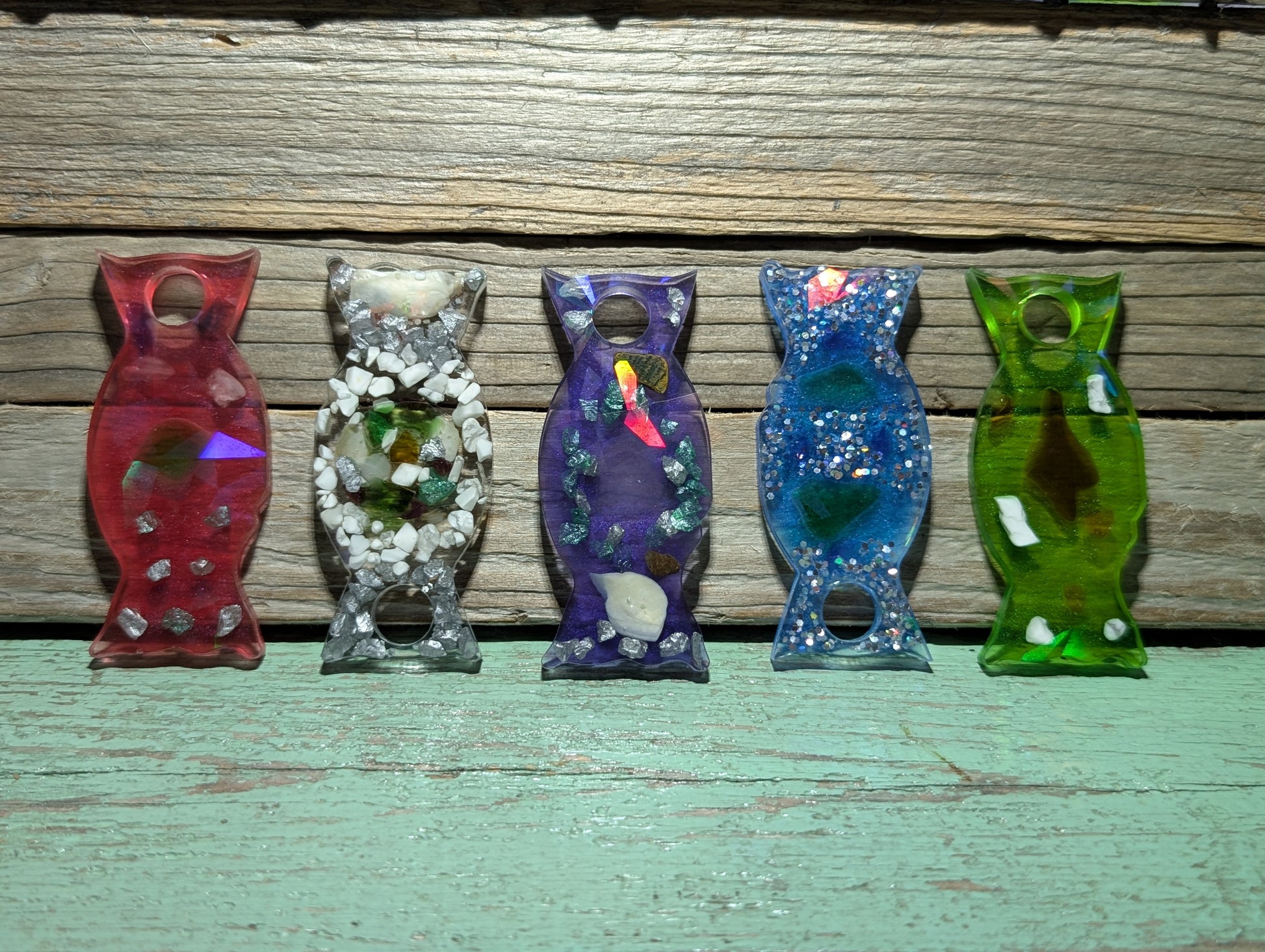 Made from a dazzling halographic mold and epoxy resin, these beauties flaunt genuine Atlantic Ocean beach treasures like tumbled glass, shell, stones and driftwood.