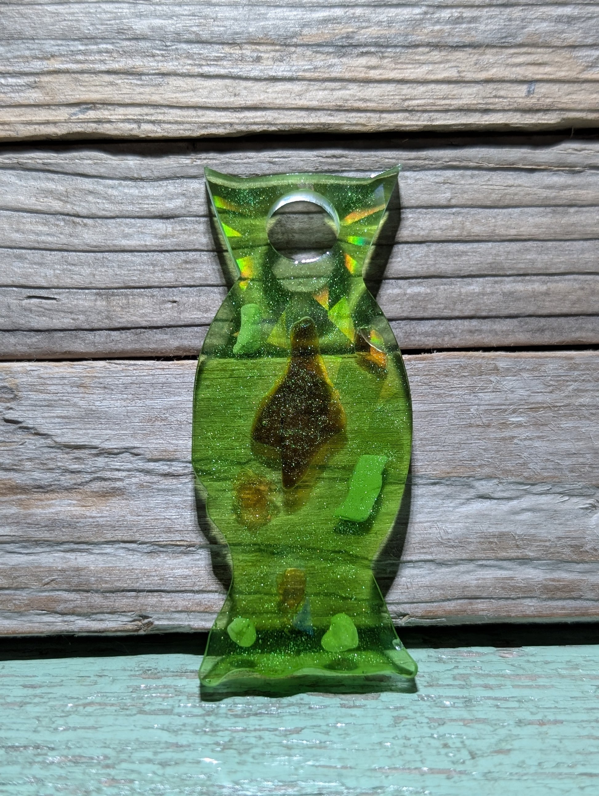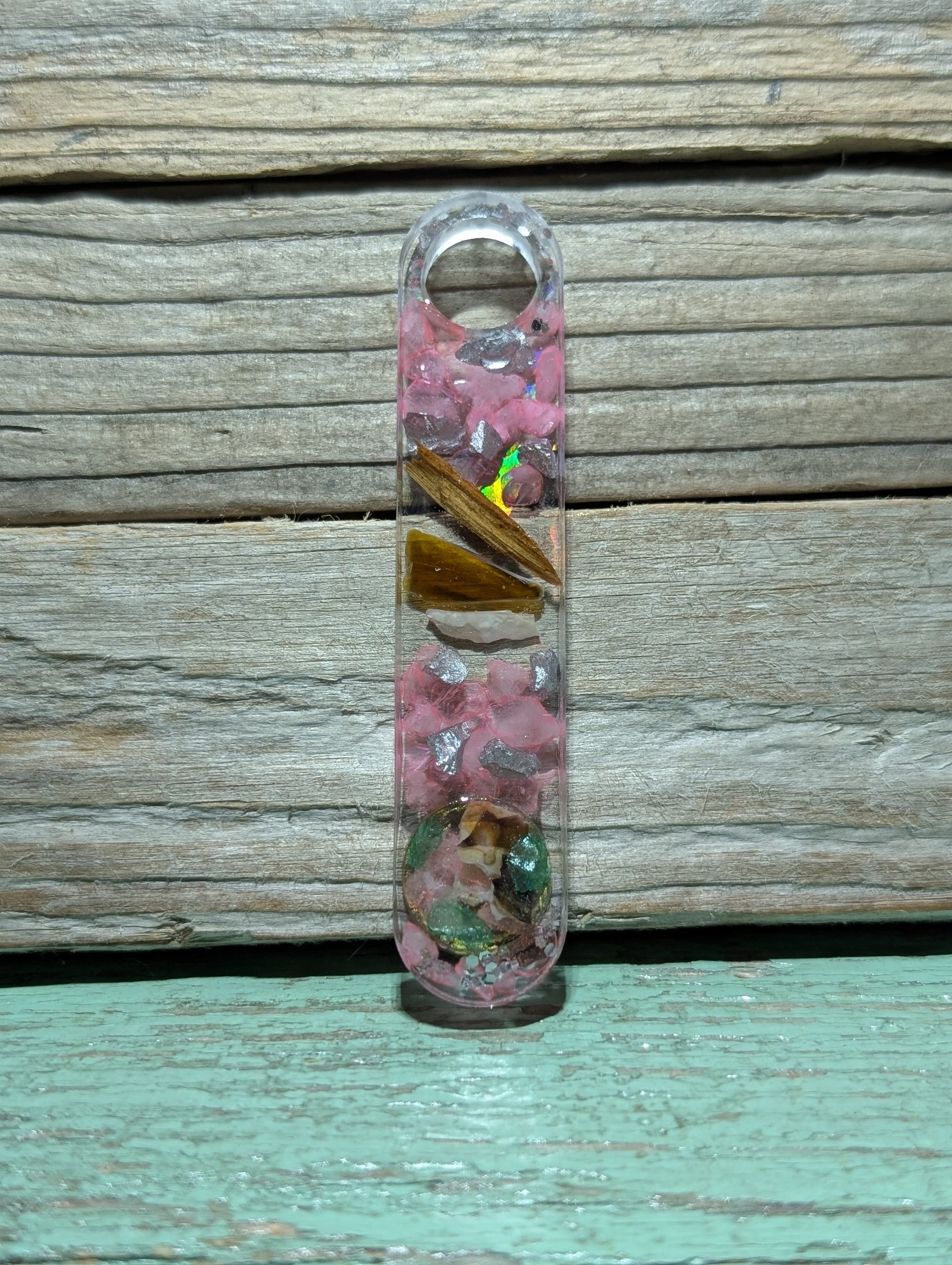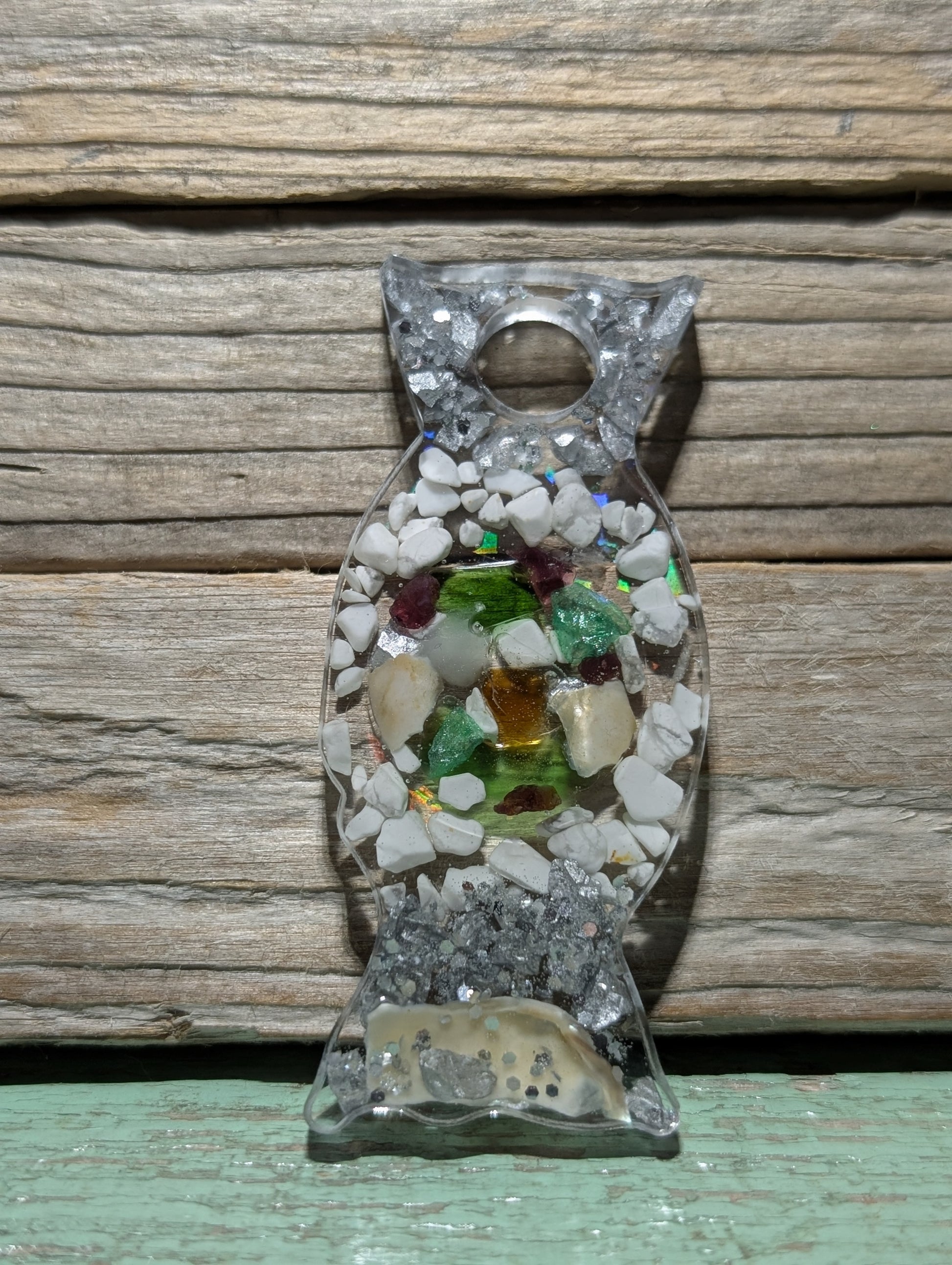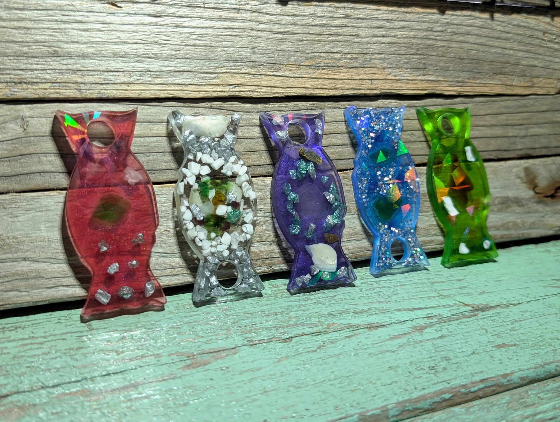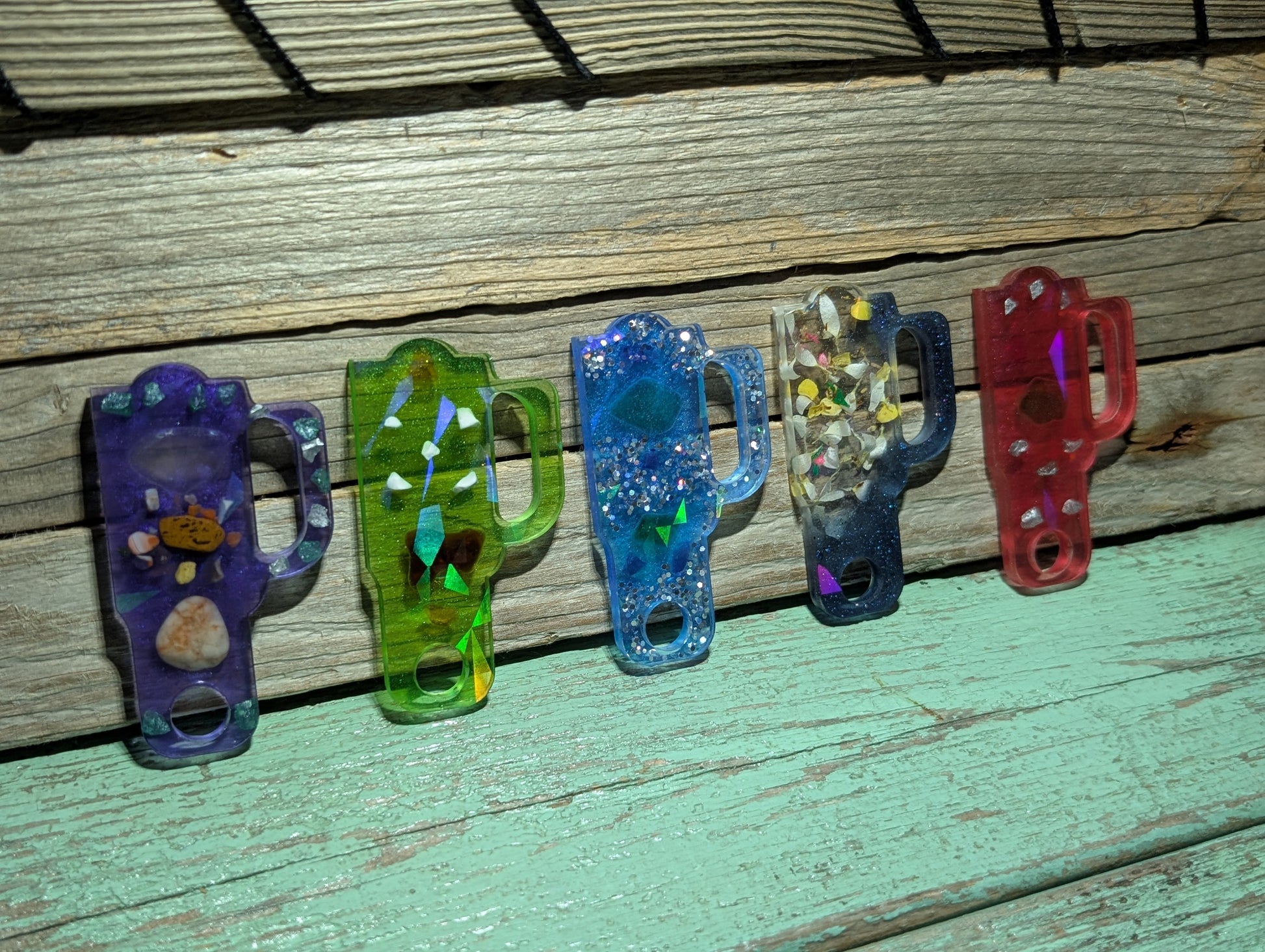 Made from a dazzling halographic mold and epoxy resin, these beauties flaunt genuine Atlantic Ocean beach treasures like tumbled glass, shell, stones and driftwood.