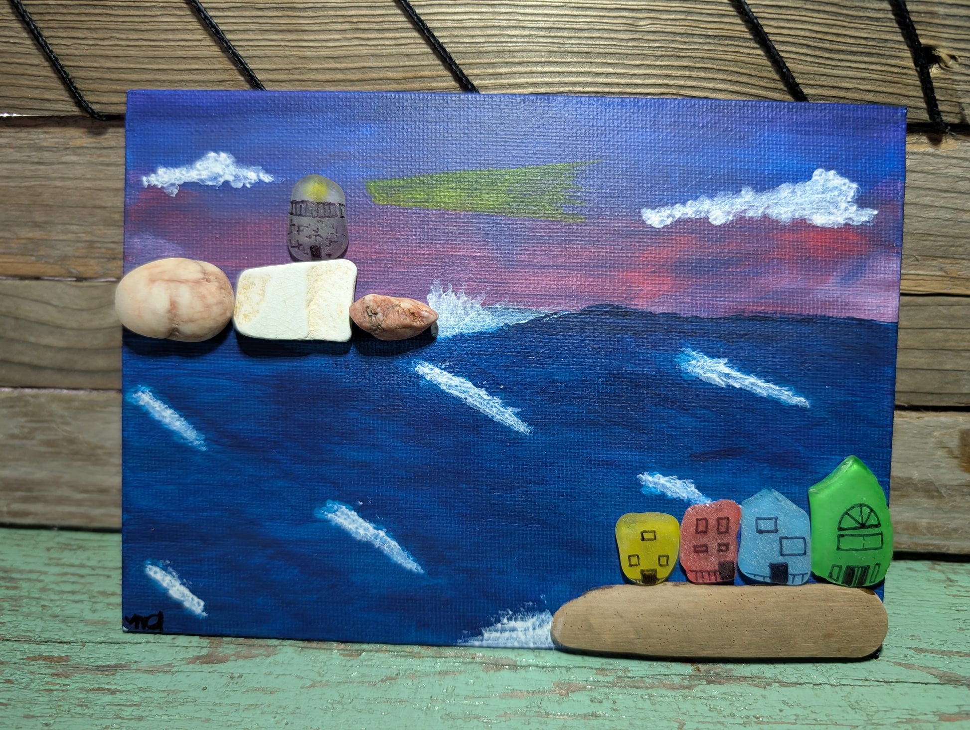 Dive into the whimsical charm of Newfoundland Coastal Living! This hand-painted treasure captures the vibrant homes of Canada’s East Coast, complete with a lighthouse beaming in the night. Crafted from authentic Newfoundland beach glass, porcelain and stone, it brings a slice of the Atlantic right to your wall (no ocean-splashing required!). Perfect for brightening up any space! At 5x7 inches and easy display with included wall stickies