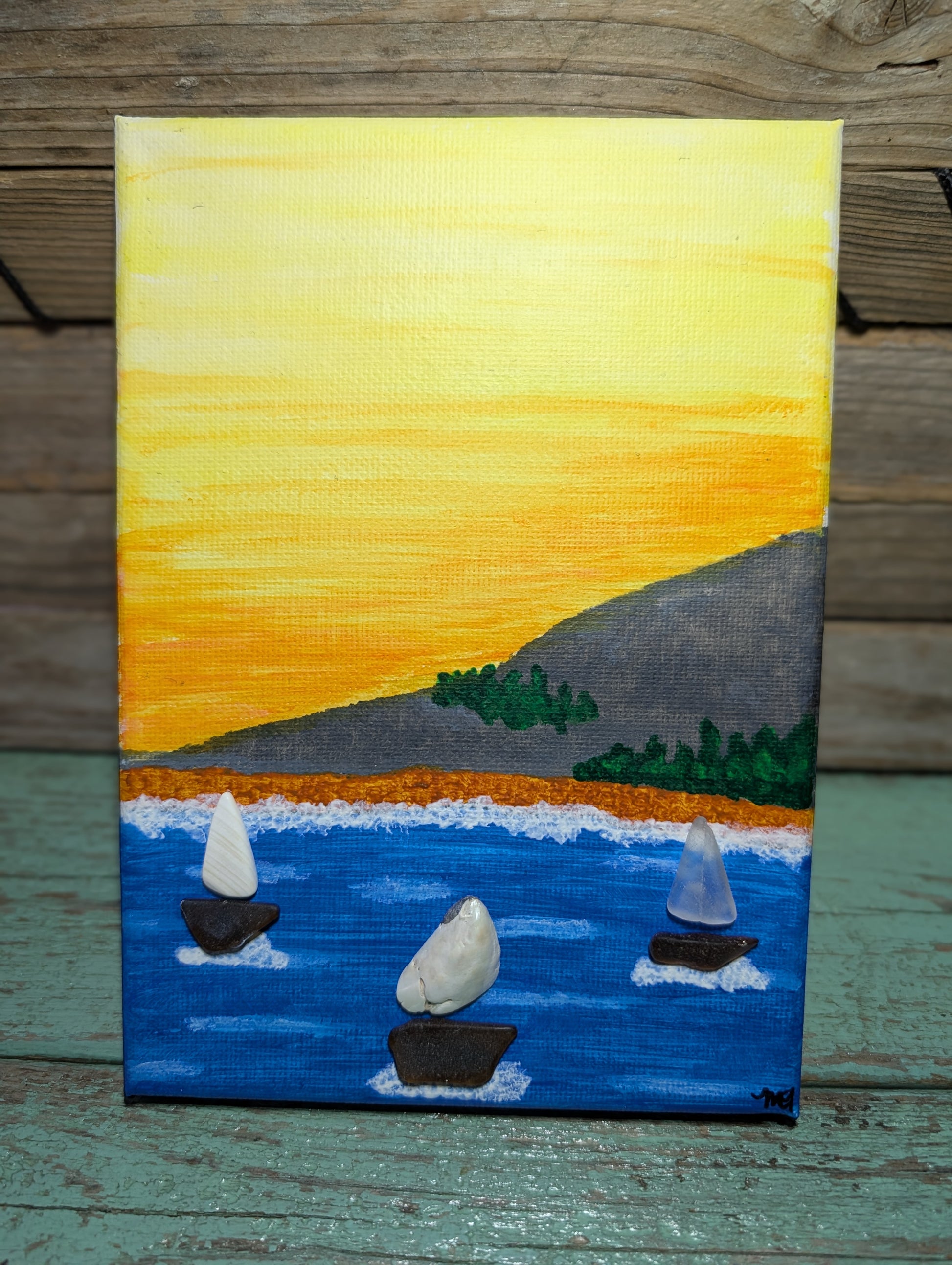 Set sail for a splash of coastal charm with Sailboat Sunset! This hand-painted beauty features three dapper sailboats gliding through a vibrant sunset. Made with genuine Atlantic beach glass and shells (because who doesn’t love a little ocean bling?), it brings the seaside right to your walls. Plus, stickies for easy display—no peg-legged pirate skills required!