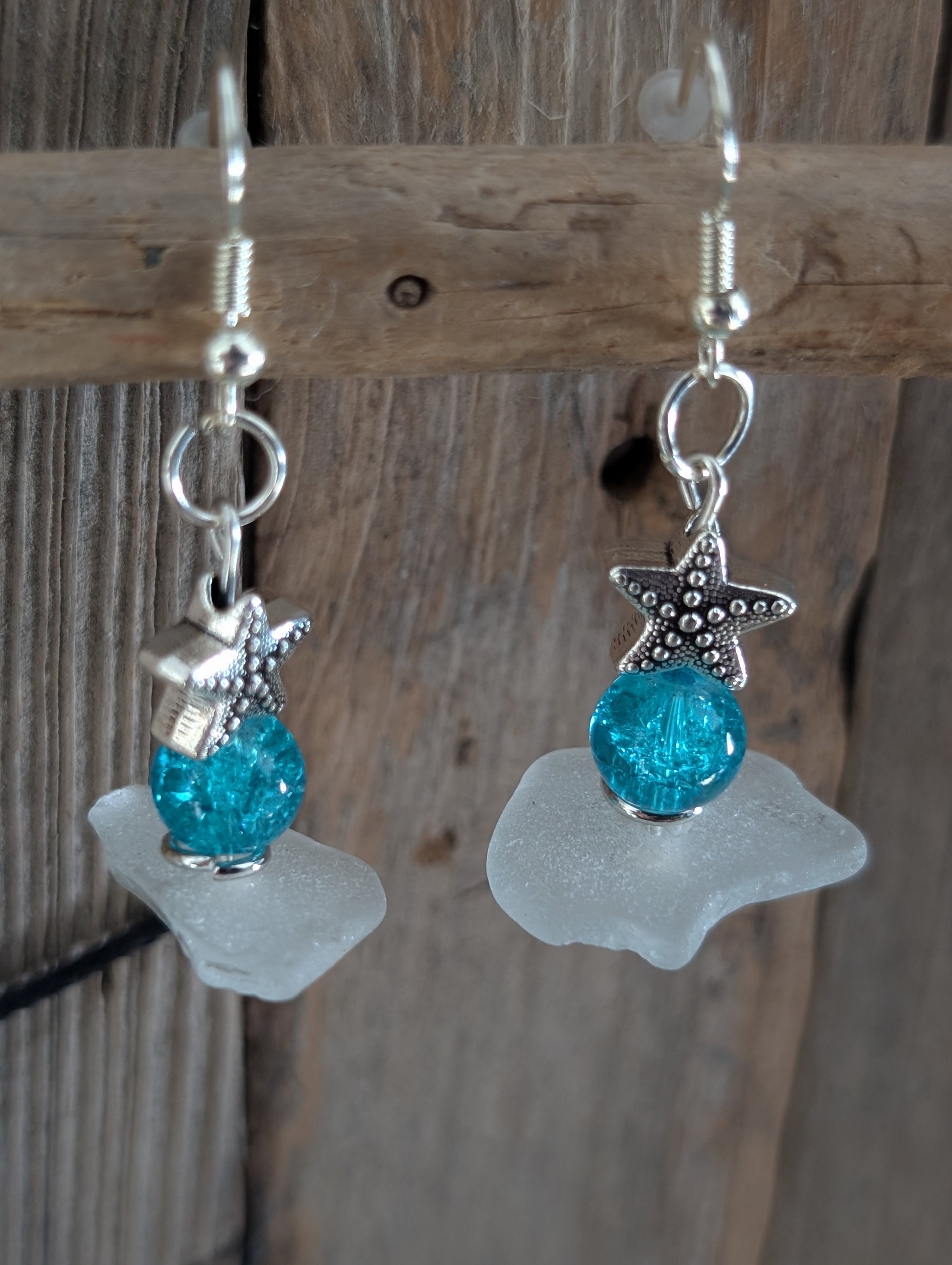 Dive into coastal charm with our Starfish Beach Glass Earrings! Crafted from genuine Atlantic Ocean white beach glass and starfish-inspired metal beads, these beauties ensure you shine brighter than a lighthouse. Plus, with silicone backings, they’ll stay put while you dance like nobody's watching! (Beach party, anyone?)